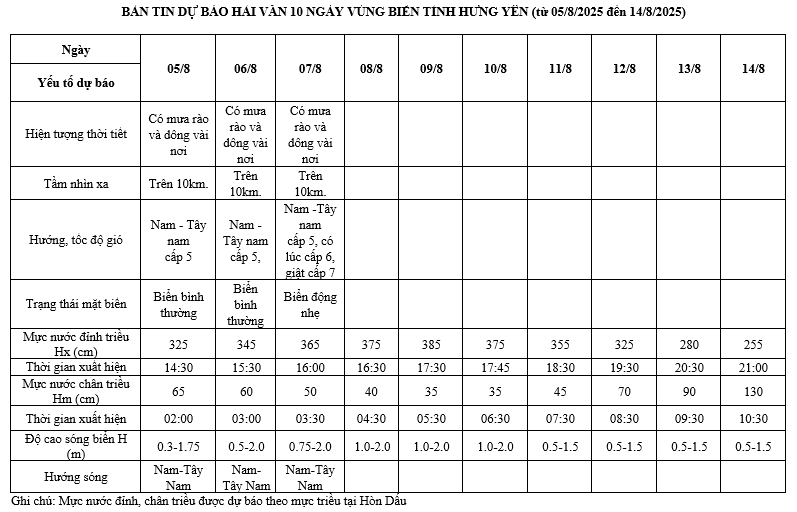 BẢN TIN DỰ BÁO HẢI VĂN 10 NGÀY VÙNG BIỂN TỈNH HƯNG YÊN (từ 05/8/2025 đến 14/8/2025)