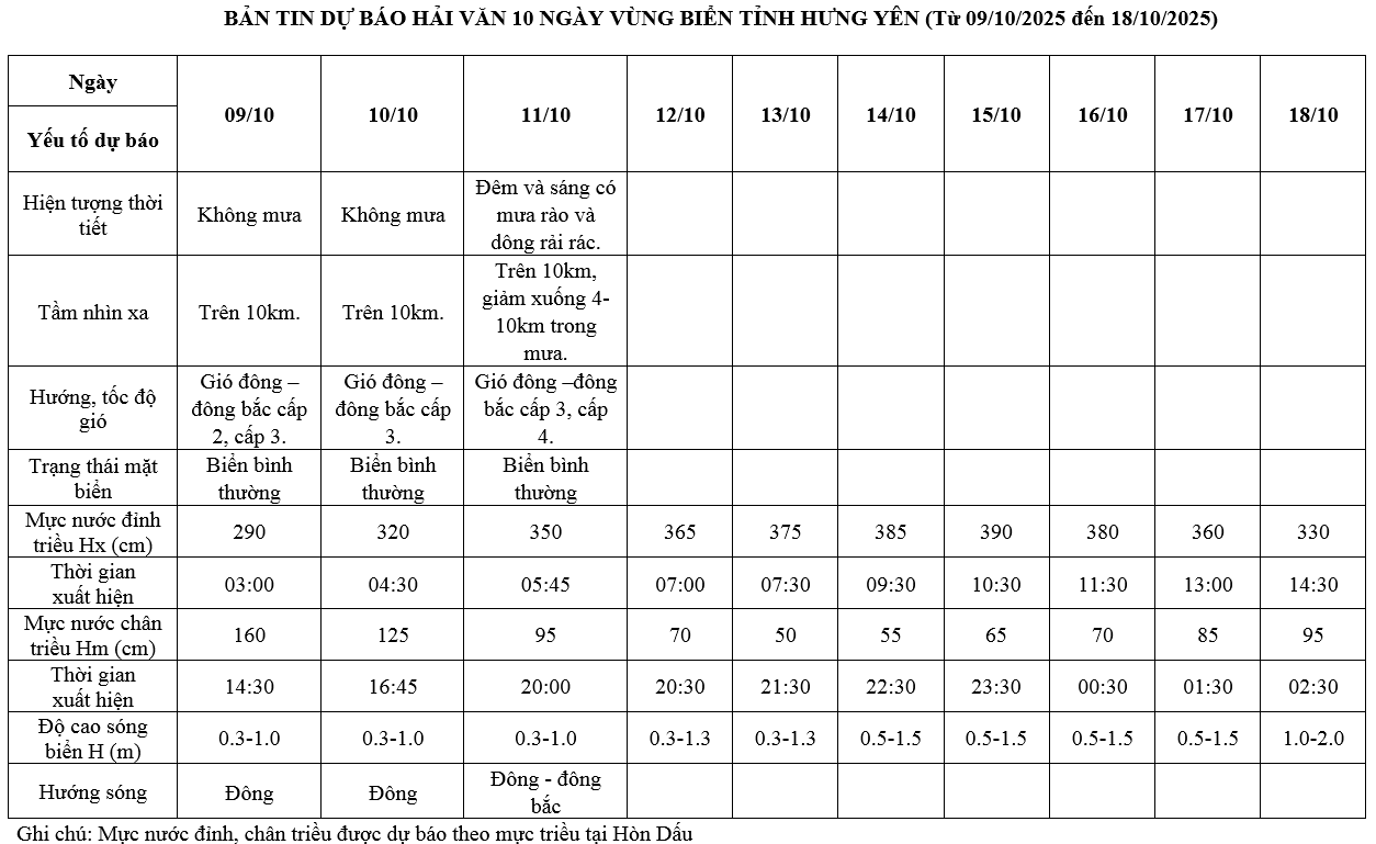 BẢN TIN DỰ BÁO HẢI VĂN 10 NGÀY VÙNG BIỂN TỈNH HƯNG YÊN (Từ 09/10/2025 đến 18/10/2025)