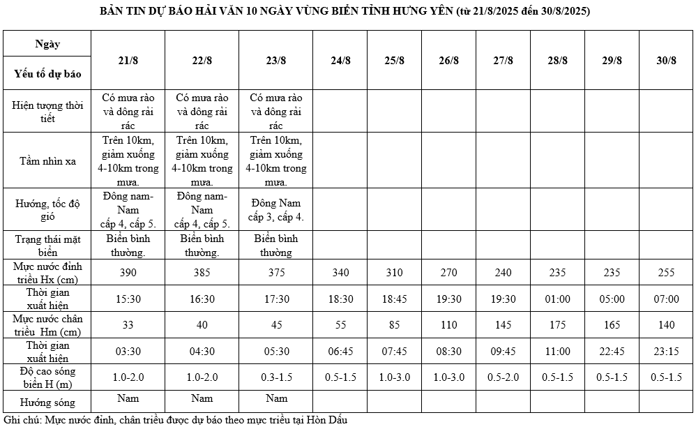 BẢN TIN DỰ BÁO HẢI VĂN 10 NGÀY VÙNG BIỂN TỈNH HƯNG YÊN (từ 21/8/2025 đến 30/8/2025)