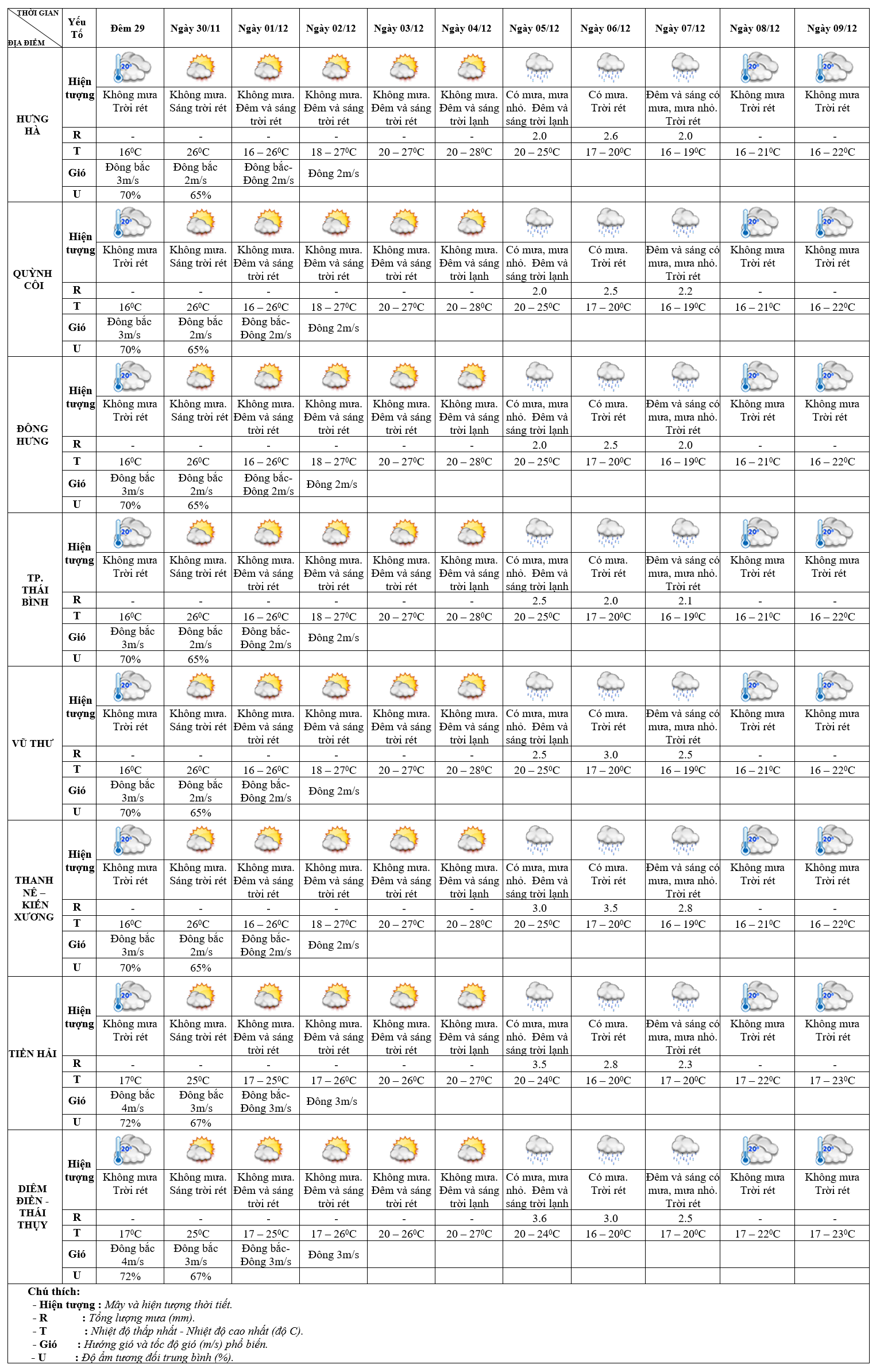DỰ BÁO THỜI TIẾT ĐIỂM 10 NGÀY KHU VỰC THÁI BÌNH TỪ ĐÊM 29/11 – 09/12/2024