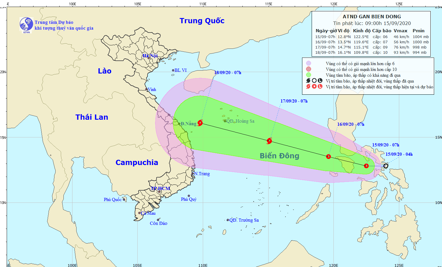 Dự báo trong 24 giờ tới, áp thấp nhiệt đới di chuyển theo hướng Tây Tây Bắc, mỗi giờ đi được khoảng 15km, đi vào Biển Đông và có khả năng mạnh thêm. Đến 07 giờ ngày 16/9, vị trí tâm áp thấp nhiệt đới ở khoảng 13,5 độ Vĩ Bắc; 119,6 độ Kinh Đông. Sức gió mạnh nhất vùng gần tâm áp thấp nhiệt đới mạnh cấp 6-7 (50-60km/giờ), giật cấp 9.