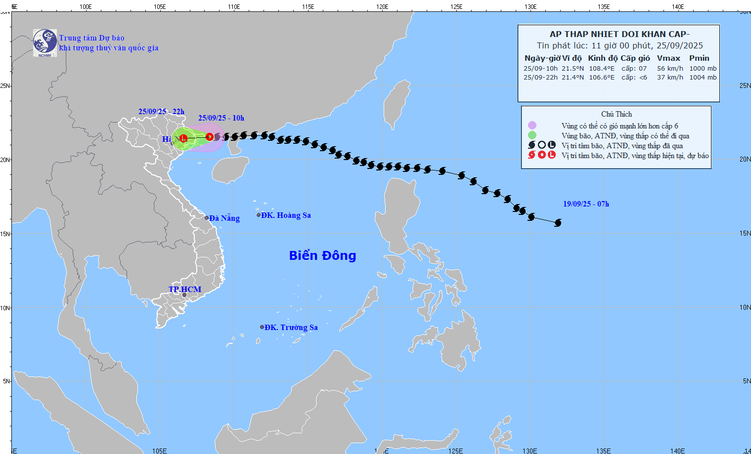 Hồi 10 giờ, vị trí tâm áp thấp nhiệt đới ở vào khoảng 21,5 độ Vĩ Bắc; 108,4 độ Kinh Đông, trên vùng biển Quảng Ninh. Sức gió mạnh nhất vùng gần tâm áp thấp nhiệt đới mạnh cấp 7 (50-61km/giờ), giật cấp 9. Di chuyển theo hướng Tây, tốc độ 15-20km/h.