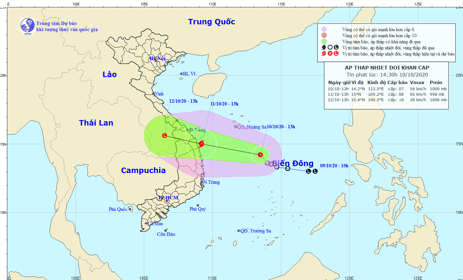 Hồi 13 giờ ngày 10/10, vị trí tâm áp thấp nhiệt đới ở khoảng 14,2 độ Vĩ Bắc; 113,5 độ Kinh Đông, cách Quảng Nam khoảng 550km, cách Quảng Ngãi khoảng 520km, cách Bình Định khoảng 470km về phía Đông. Sức gió mạnh nhất vùng gần tâm áp thấp nhiệt đới mạnh cấp 7 (50-60km/giờ), giật cấp 9. Bán kính gió mạnh từ cấp 6 trở lên khoảng 100km tính từ tâm áp thấp nhiệt đới.