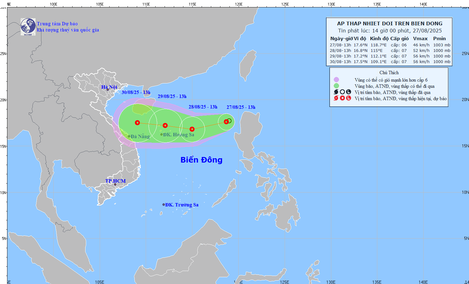 Hồi 13 giờ ngày 27/8, vị trí tâm áp thấp nhiệt đới ở vào khoảng 17,6 độ Vĩ Bắc; 118,7 độ Kinh Đông trên vùng biển phía Đông khu vực Bắc Biển Đông. Sức gió mạnh nhất vùng gần tâm áp thấp nhiệt đới mạnh cấp 6 (39-49km/giờ), giật cấp 8. Di chuyển theo hướng Tây Tây Nam với tốc độ 10-15km/h.