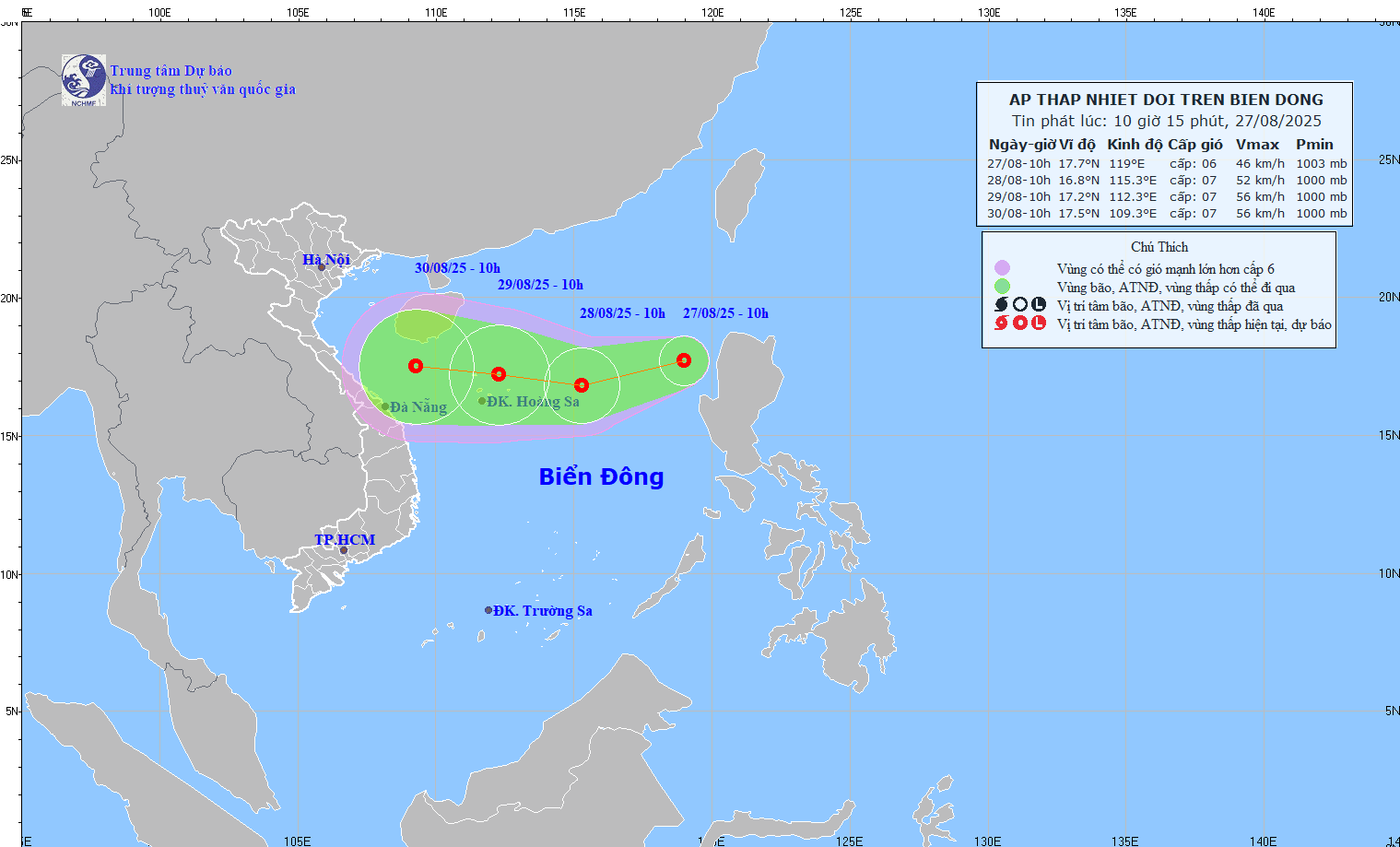 Sáng nay (27/8), vùng áp thấp trên vùng biển phía Đông khu vực Bắc Biển Đông đã mạnh lên thành áp thấp nhiệt đới.