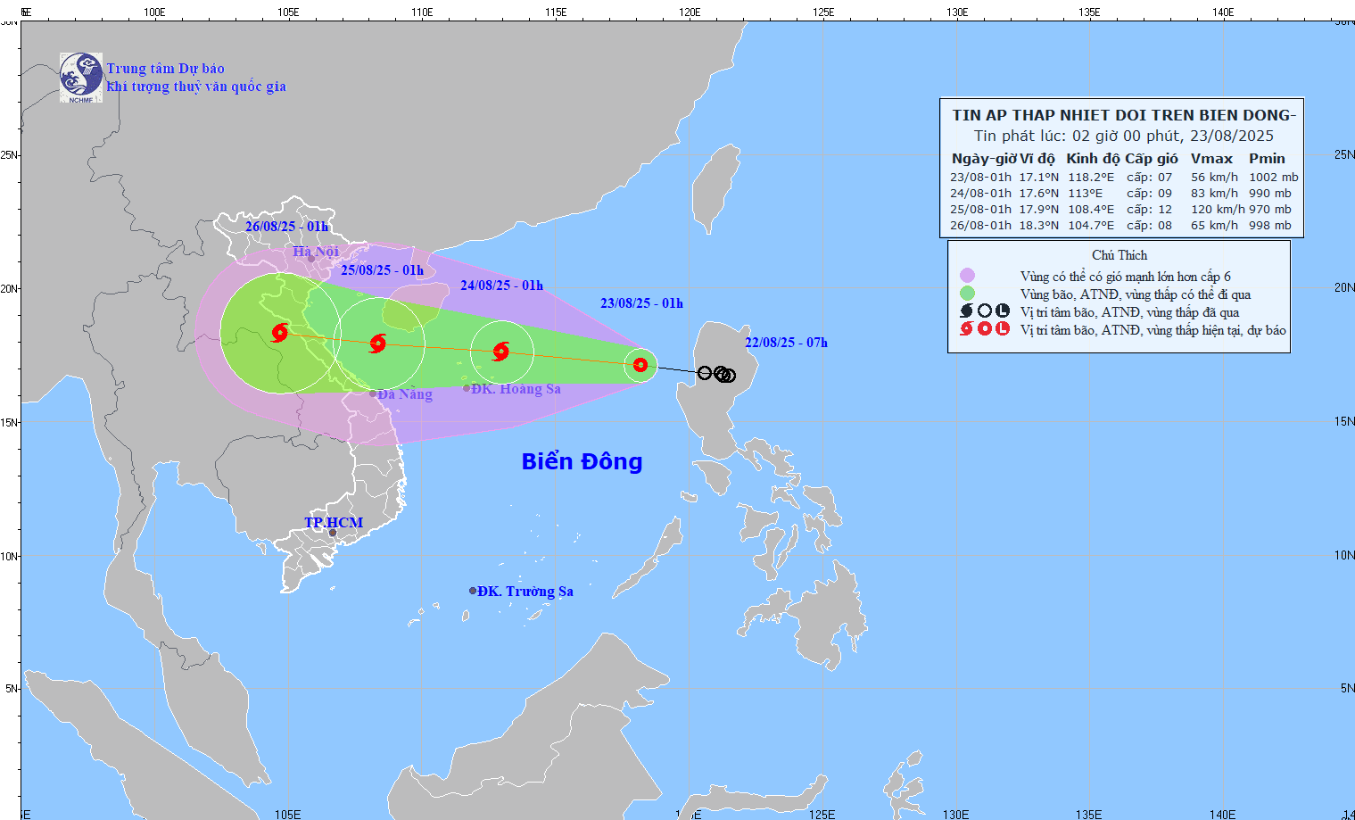 Hồi 01 giờ ngày 23/8, vị trí tâm áp thấp nhiệt đới ở vào khoảng 17,1 độ Vĩ Bắc; 118,2 độ Kinh Đông, cách đặc khu Hoàng Sa khoảng 730km về phía Đông. Sức gió mạnh nhất ở vùng gần tâm áp thấp nhiệt đới mạnh cấp 7 (50-61km/h), giật cấp 9; di chuyển theo hướng Tây Tây Bắc với tốc độ khoảng 25km/h.