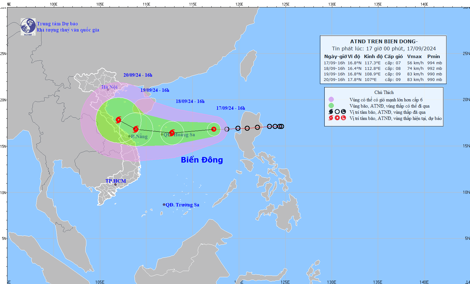 Hồi 16 giờ ngày 17/9, vị trí tâm áp thấp nhiệt đới ở vào khoảng 16,8 độ Vĩ Bắc; 117,3 độ Kinh Đông, trên vùng biển phía Đông khu vực Bắc Biển Đông, cách quần đảo Hoàng Sa khoảng 620km về phía Đông. Sức gió mạnh nhất vùng gần tâm áp thấp nhiệt đới mạnh cấp 7 (50-61km/h), giật cấp 9; di chuyển chủ yếu theo hướng Tây với tốc độ khoảng 25-30km/h.