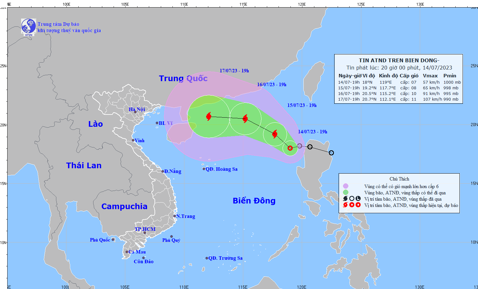 Hồi 19 giờ (14/7), vị trí tâm áp thấp nhiệt đới ở vào khoảng 18,0 độ Vĩ Bắc; 119,0 độ Kinh Đông, trên vùng biển phía Đông khu vực Bắc Biển Đông. Sức gió mạnh nhất vùng gần tâm áp thấp nhiệt đới mạnh cấp 6-7 (39-61km/giờ), giật cấp 9.