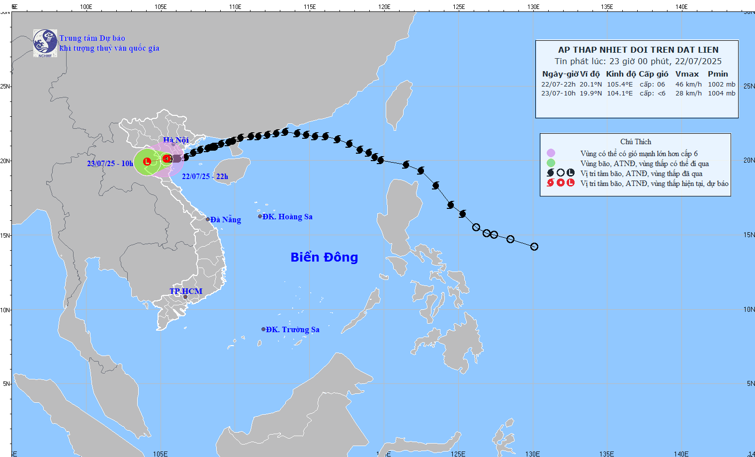 Trong 12 giờ tới, Áp thấp nhiệt đới di chuyển theo hướng Tây Tây Nam, tốc độ khoảng 10km/h và suy yếu dần thành vùng áp thấp; đến 10h ngày 23/7, vị trí tâm vùng áp thấp 19,9N-104,1E; trên khu vực Thượng Lào; cường độ dưới cấp 6.