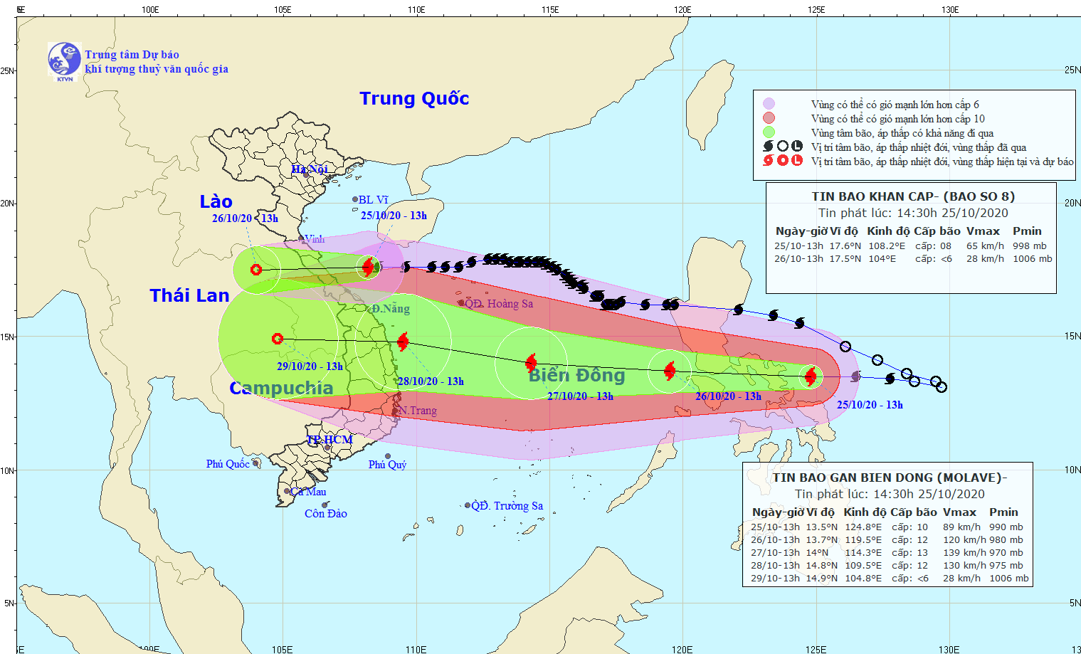 Dự báo trong 24 giờ tới, bão di chuyển theo hướng Tây, mỗi giờ đi được khoảng 20km, đi vào Biển Đông và tiếp tục mạnh thêm. Đến 13 giờ ngày 26/10, vị trí tâm bão ở khoảng 13,7 độ Vĩ Bắc; 119,5 độ Kinh Đông, trên khu vực miền Trung Phi-líp-pin. Sức gió mạnh nhất vùng gần tâm bão mạnh cấp 11 (100-115km/giờ), giật cấp 13.