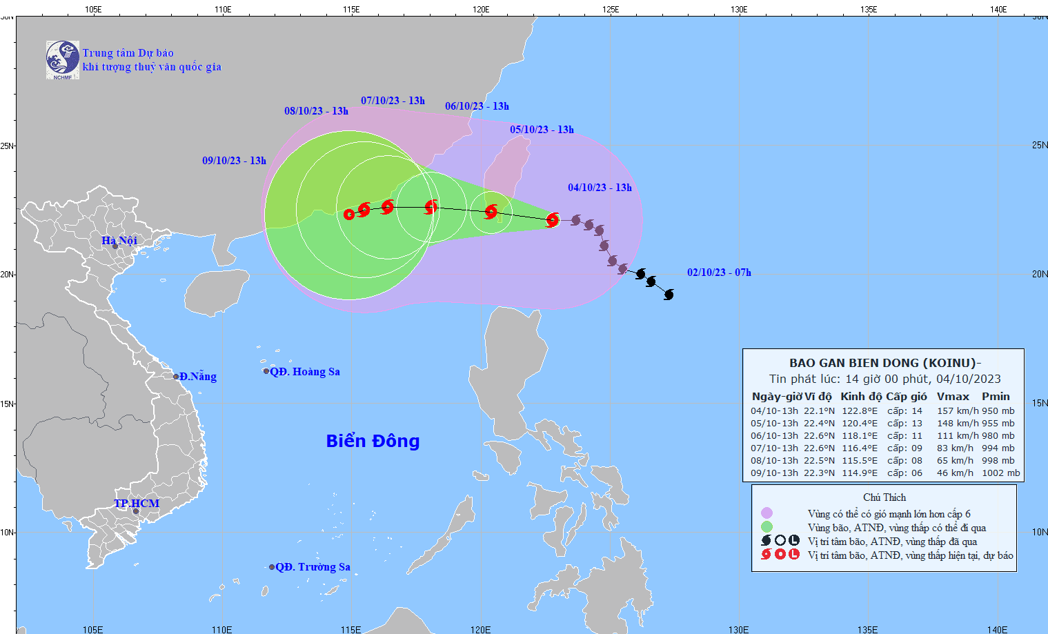 Hồi 13 giờ ngày 04/10, vị trí tâm bão ở vào khoảng 22,1 độ Vĩ Bắc; 122,8 độ Kinh Đông, trên vùng biển phía Đông Nam đảo Đài Loan (Trung Quốc). Sức gió mạnh nhất vùng gần tâm bão mạnh cấp 14 (150-166km/h), giật cấp 17, di chuyển theo hướng Tây, tốc độ khoảng 15km/h.