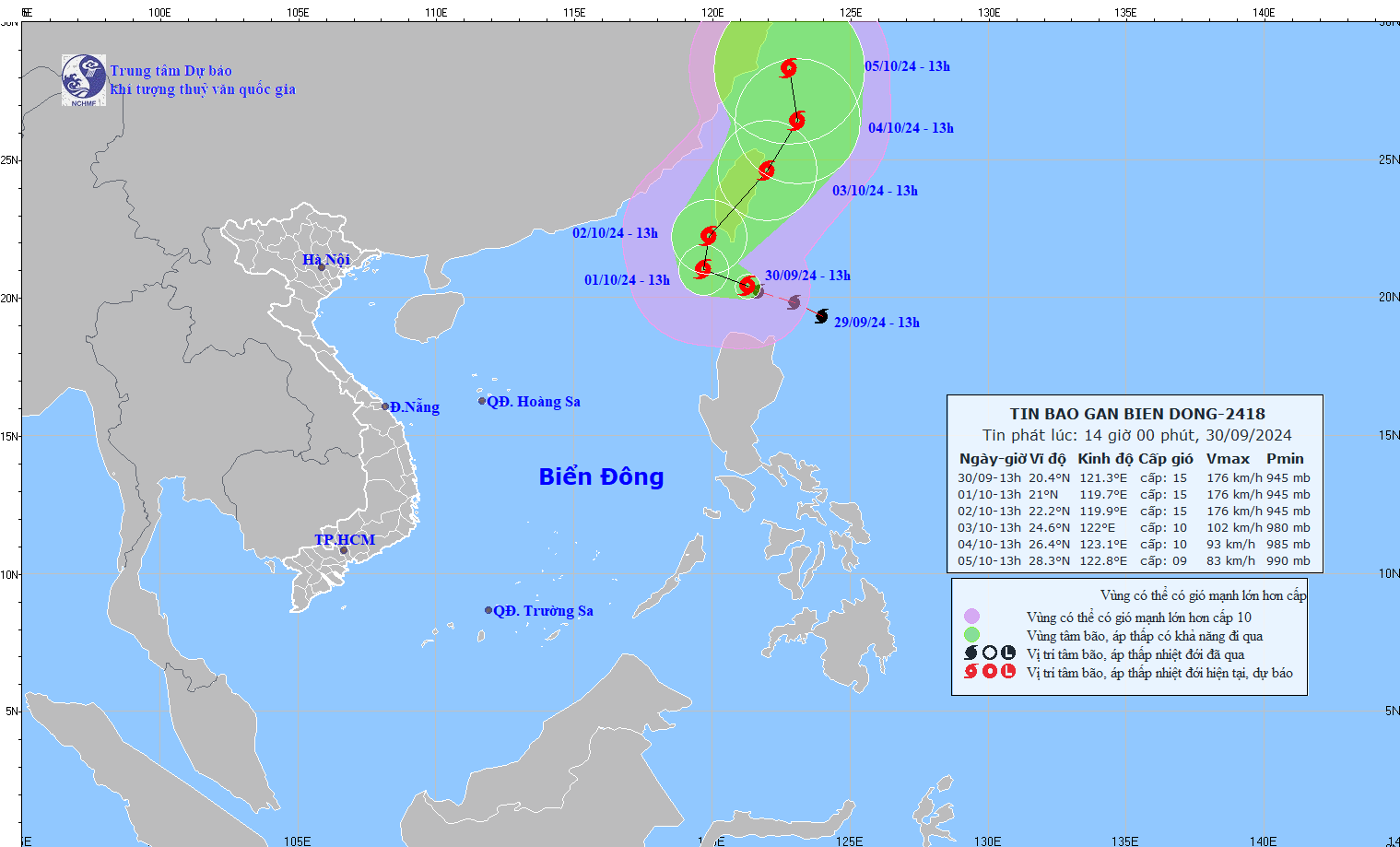 Hồi 13 giờ ngày 30/9, vị trí tâm bão ở vào khoảng 20,4 độ Vĩ Bắc; 121,3 độ Kinh Đông, trên vùng biển phía Bắc đảo Lu-Dông (Philippin). Sức gió mạnh nhất vùng gần tâm bão mạnh cấp 15 (167-183km/h), giật trên cấp 17. Di chuyển theo hướng Tây Tây Bắc, tốc độ 10-15km/h.