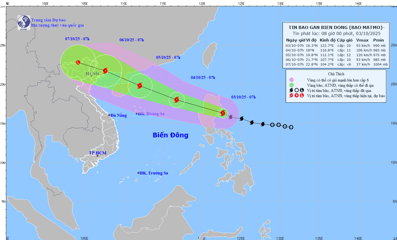 Hồi 07 giờ ngày 03/10, vị trí tâm bão ở vào khoảng 16,3 độ Vĩ Bắc; 122,7 độ Kinh Đông, trên vùng biển phía Đông đảo Lu-Dông (Phi-líp-pin). Sức gió mạnh nhất vùng gần tâm bão mạnh cấp 9-10 (75-102km/giờ), giật cấp 13. Di chuyển theo hướng Tây Tây Bắc, tốc độ khoảng 25km/h.