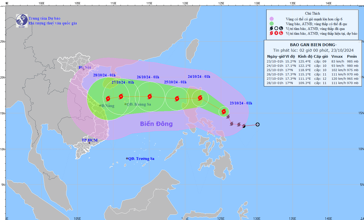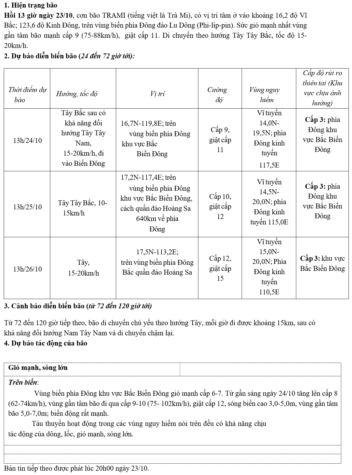 Tin bão gần biển Đông cơn bão (TRAMI) hồi 13h ngày 23/10/2024