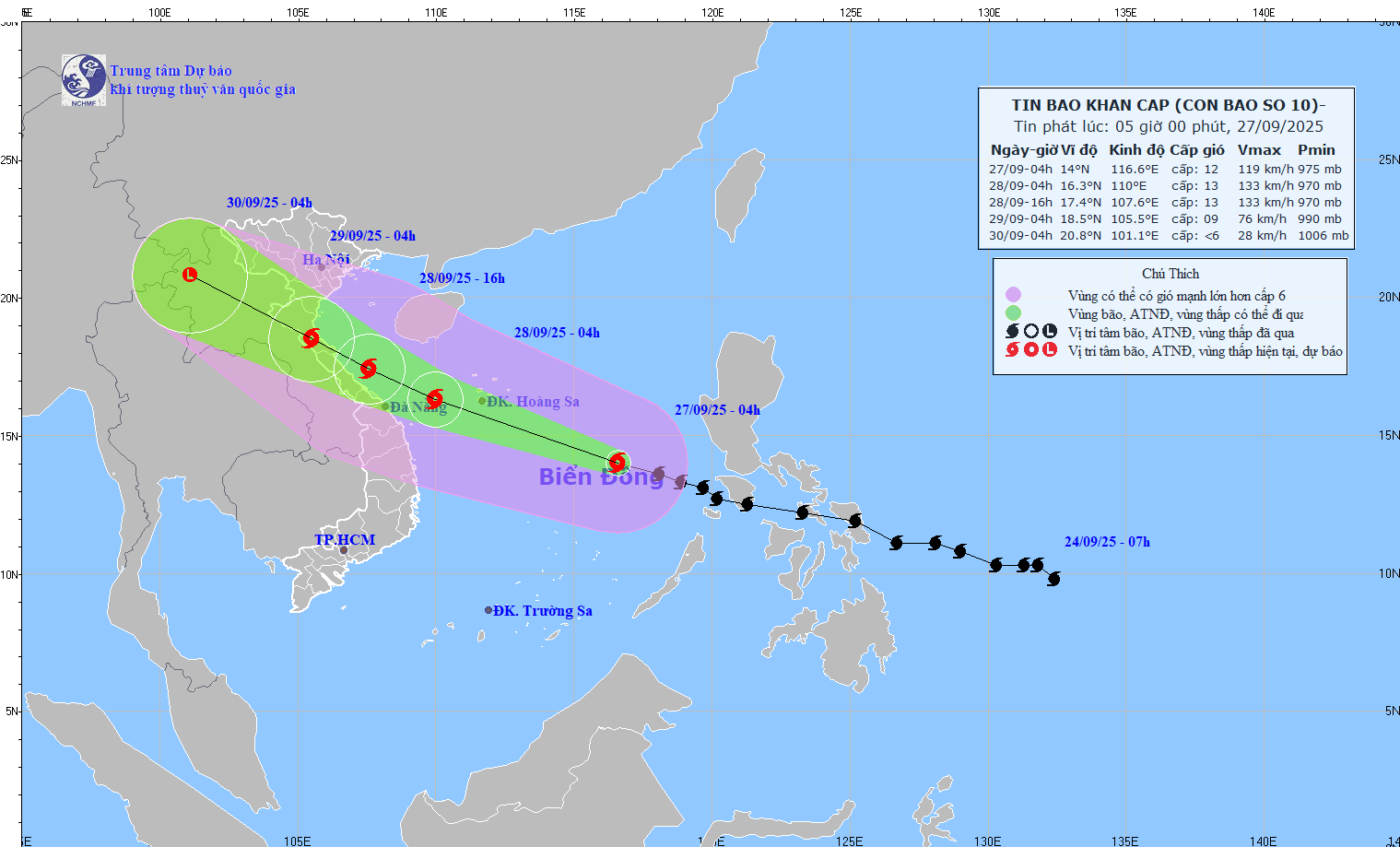 Trong 24 giờ tới, bão di chuyển theo hướng Tây Tây Bắc, tốc độ khoảng 30- 35km/h và có khả năng mạnh thêm; đến 04h ngày 28/9, vị trí tâm bão ở vào khoảng 16,3N-110,0E, trên vùng biển phía Tây đặc khu Hoàng Sa, cách Tp. Đà Nẵng khoảng 180km về phía Đông; cường độ cấp 12-13, giật cấp 16.