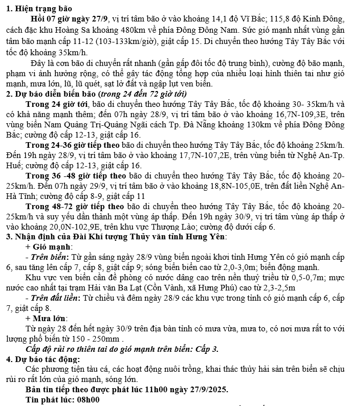 TIN BÃO KHẨN CẤP - CƠN BÃO SỐ 10 (HỒI 07h NGÀY 27/9/2025)