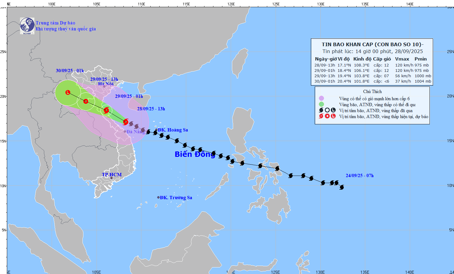 Hồi 13 giờ ngày 28/9, vị trí tâm bão ở vào khoảng 17,1 độ Vĩ Bắc; 108,3 độ Kinh Đông, trên vùng biển Quảng Trị-Tp. Đà Nẵng, cách Tp. Huế khoảng 90km về phía Đông Đông Bắc, cách Bắc Quảng Trị khoảng 190km về phía Nam Đông Nam. Sức gió mạnh nhất vùng gần tâm bão mạnh cấp 12 (118-133km/giờ), giật cấp 15. Di chuyển theo hướng Tây Tây Bắc với tốc độ khoảng 25km/h.