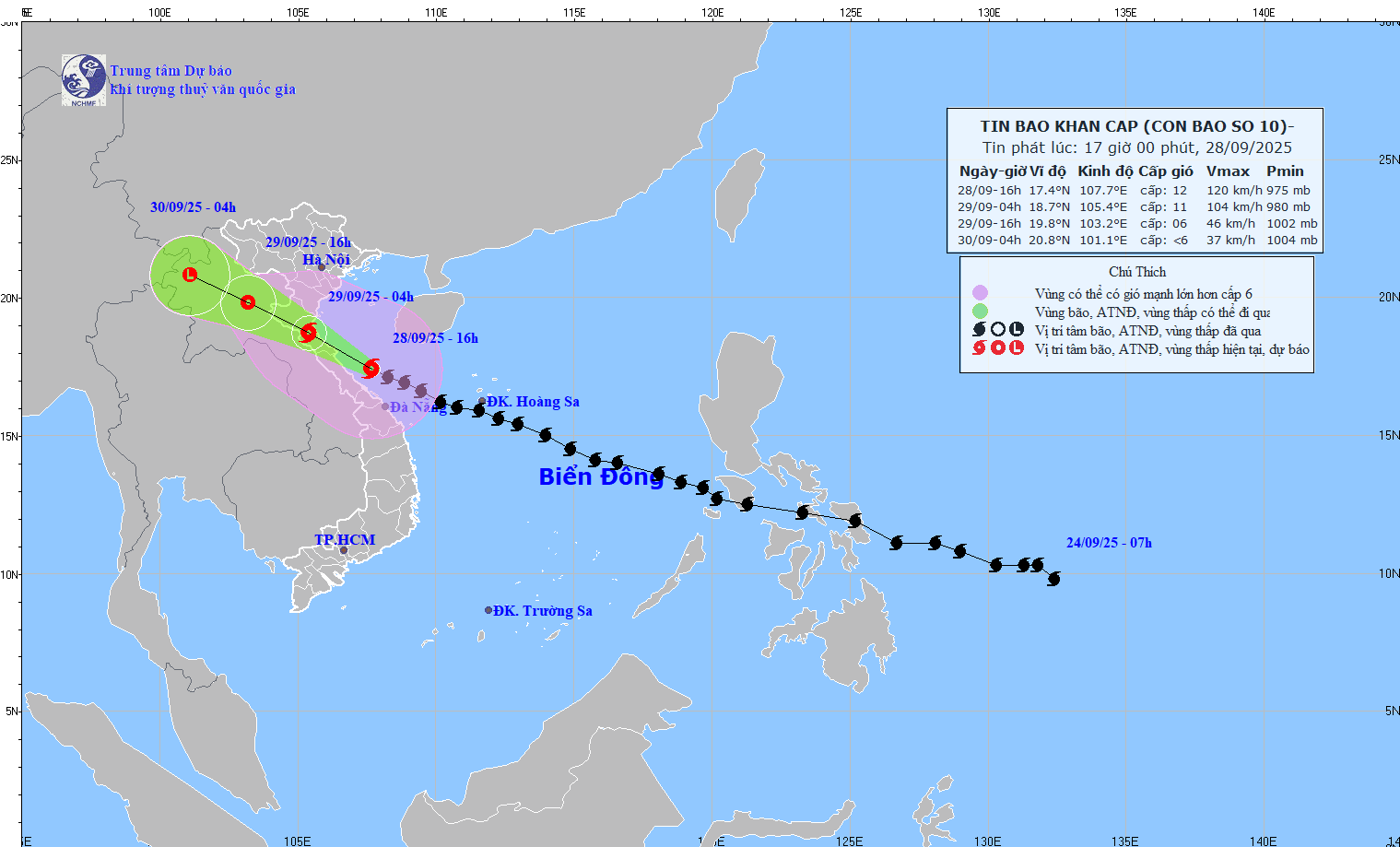 Hồi 16 giờ ngày 28/9, vị trí tâm bão ở vào khoảng 17,4 độ Vĩ Bắc; 107,7 độ Kinh Đông, trên vùng biển Quảng Trị-Tp. Huế, cách Bắc Quảng Trị khoảng 120km về phía Đông. Sức gió mạnh nhất vùng gần tâm bão mạnh cấp 12 (118-133km/giờ), giật cấp 15. Di chuyển theo hướng Tây Tây Bắc, tốc độ khoảng 25km/h.