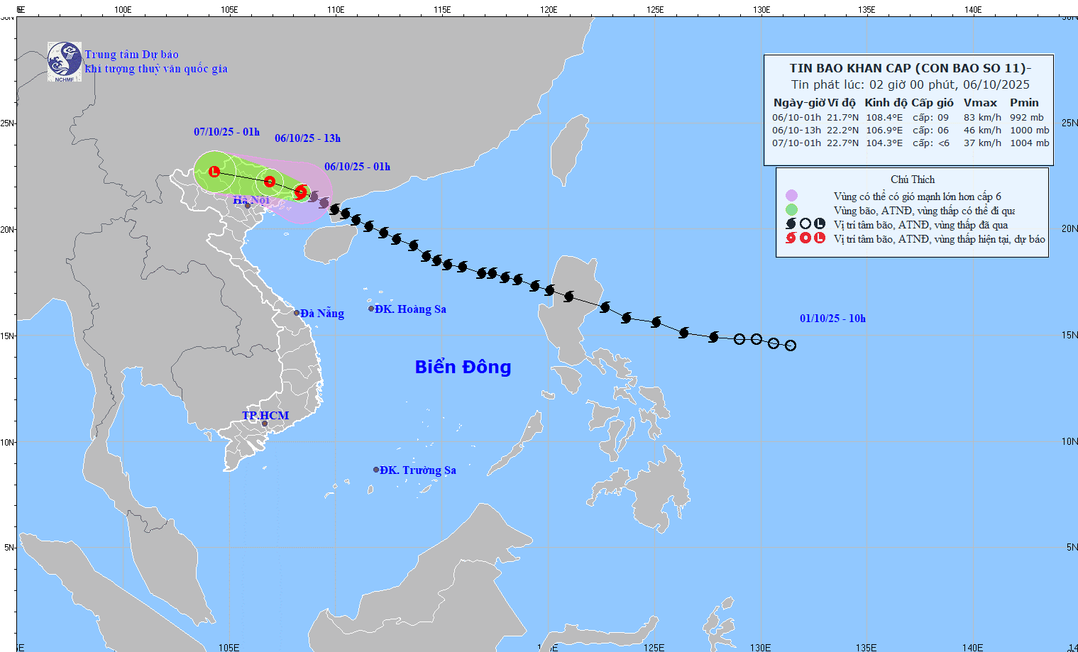 Hồi 01 giờ ngày 06/10, vị trí tâm bão ở vào khoảng 21,7 độ Vĩ Bắc; 108,4 độ Kinh Đông, trên vùng bờ biển tỉnh Quảng Tây (Trung Quốc). Sức gió mạnh nhất vùng gần tâm bão mạnh cấp 8-9 (62-88km/giờ), giật cấp 11. Di chuyển theo hướng Tây Tây Bắc, tốc độ khoảng 20km/h.
