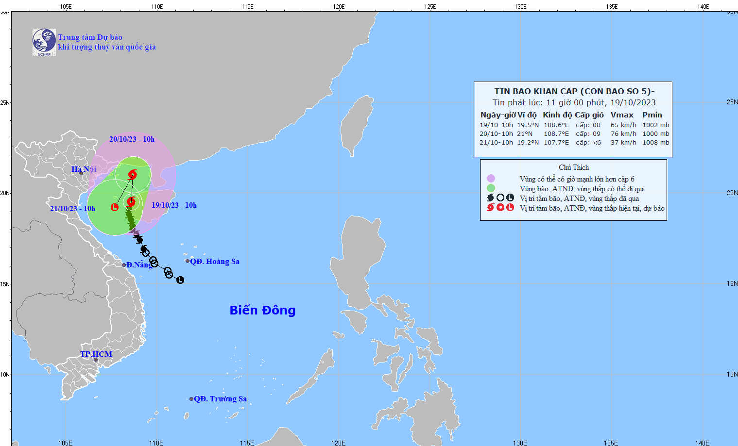 Hồi 10 giờ ngày 19/10, vị trí tâm bão ở vào khoảng 19,5 độ Vĩ Bắc; 108,6 độ Kinh Đông, trên vùng biển phía Đông Vịnh Bắc Bộ. Sức gió mạnh nhất vùng gần tâm bão mạnh cấp 8 (62-74km/giờ), giật cấp 10. Di chuyển theo hướng Bắc với tốc độ khoảng 10km/h.