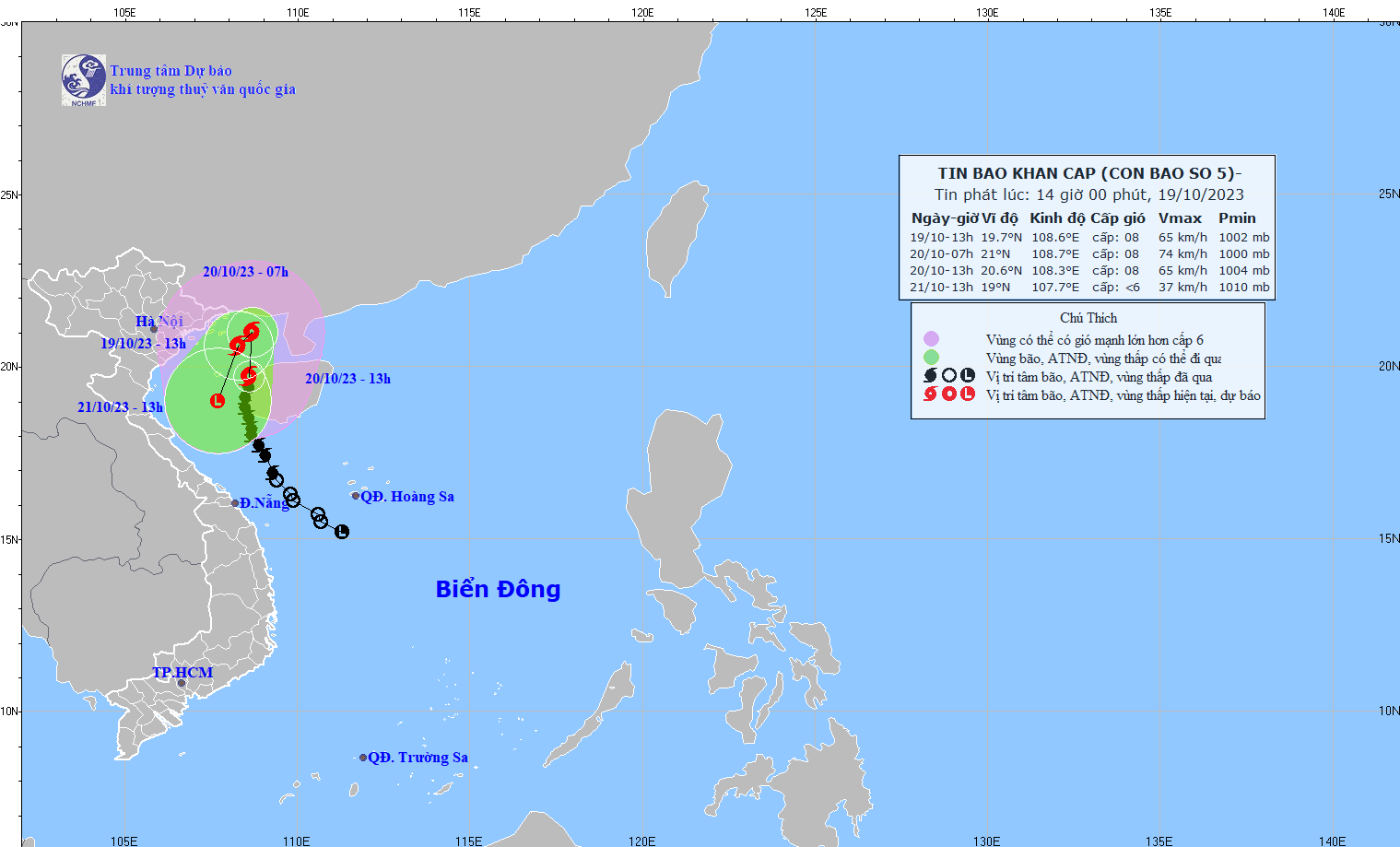 Hồi 13 giờ ngày 19/10, vị trí tâm bão ở vào khoảng 19,7 độ Vĩ Bắc; 108,6 độ Kinh Đông, trên vùng biển phía Đông Vịnh Bắc Bộ. Sức gió mạnh nhất vùng gần tâm bão mạnh cấp 8 (62-74km/giờ), giật cấp 10. Di chuyển theo hướng Bắc với tốc độ khoảng 10km/h.