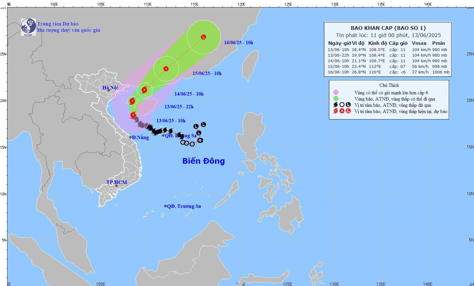 Hồi 10 giờ ngày 13/6, vị trí tâm bão ở vào khoảng 18,4 độ Vĩ Bắc; 108,5 độ Kinh Đông, trên vùng biển phía Tây Nam đảo Hải Nam (Trung Quốc). Sức gió mạnh nhất vùng gần tâm bão mạnh cấp 11 (103-117km/h), giật cấp 14; di chuyển theo hướng Bắc Tây Bắc với tốc độ 10-15km/h.