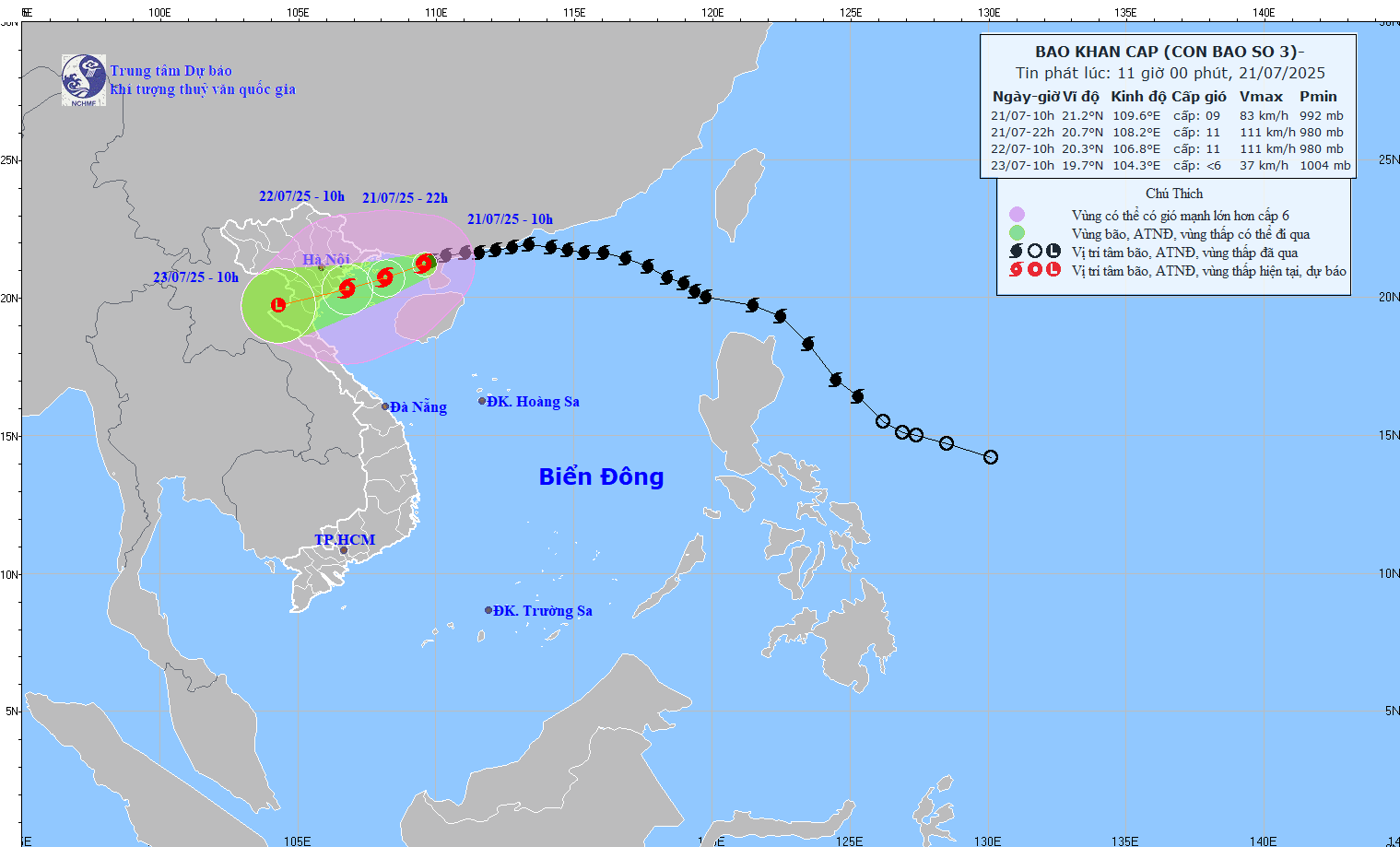 Trong 12- 24 giờ tiếp theo, bão di chuyển theo hướng Tây Tây Nam, tốc độ khoảng 10-15km/h; đến 10h ngày 22/7, vị trí tâm bão 20,3N-106,8E; trên vùng biển từ Hải Phòng-Thanh Hoá; cường độ cấp 10-11, giật cấp 14.