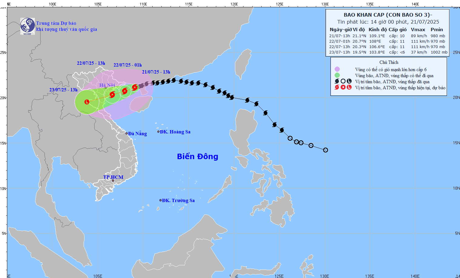 Hồi 13 giờ ngày 21/7, vị trí tâm bão ở vào khoảng 21,1 độ Vĩ Bắc; 109,1 độ Kinh Đông, cách Quảng Ninh khoảng 120km, cách Hải Phòng 260km về phía Đông; cách Hưng Yên khoảng 280km, cách Ninh Bình khoảng 310km về phía Đông Đông Bắc. Sức gió mạnh nhất vùng gần tâm bão mạnh cấp 9-10 (75-102km/giờ), giật cấp 12; di chuyển theo hướng Tây Tây Nam với tốc độ 10-15km/h