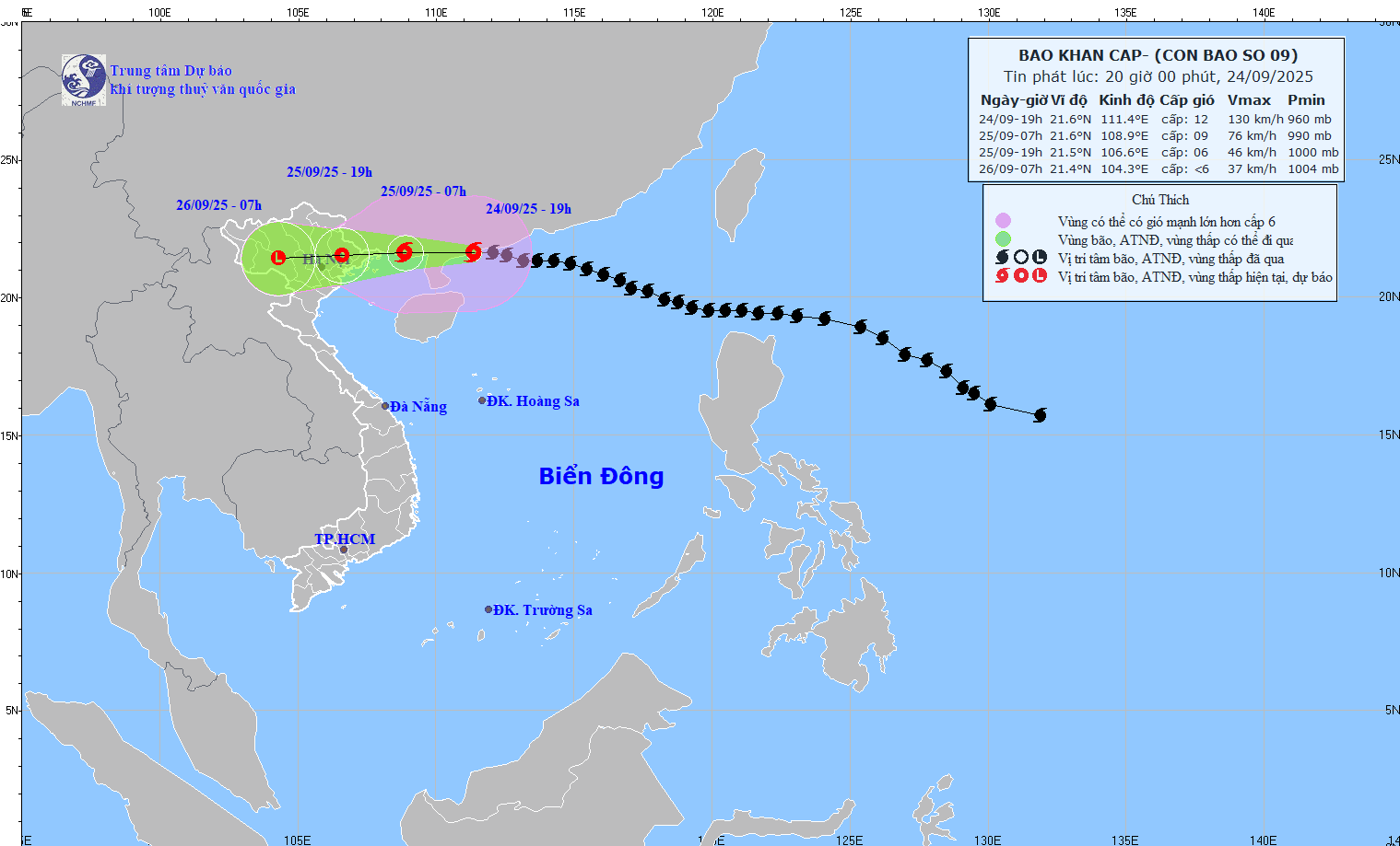 Hồi 19 giờ ngày 24/9, vị trí tâm bão ở vào khoảng 21,6 độ Vĩ Bắc; 111,4 độ Kinh Đông, cách Móng Cái (Quảng Ninh) khoảng 375km về phía Đông. Sức gió mạnh nhất vùng gần tâm bão mạnh cấp 12 (118-133km/giờ), giật cấp 15. Di chuyển theo hướng Tây Tây Bắc với tốc độ khoảng 20km/h.