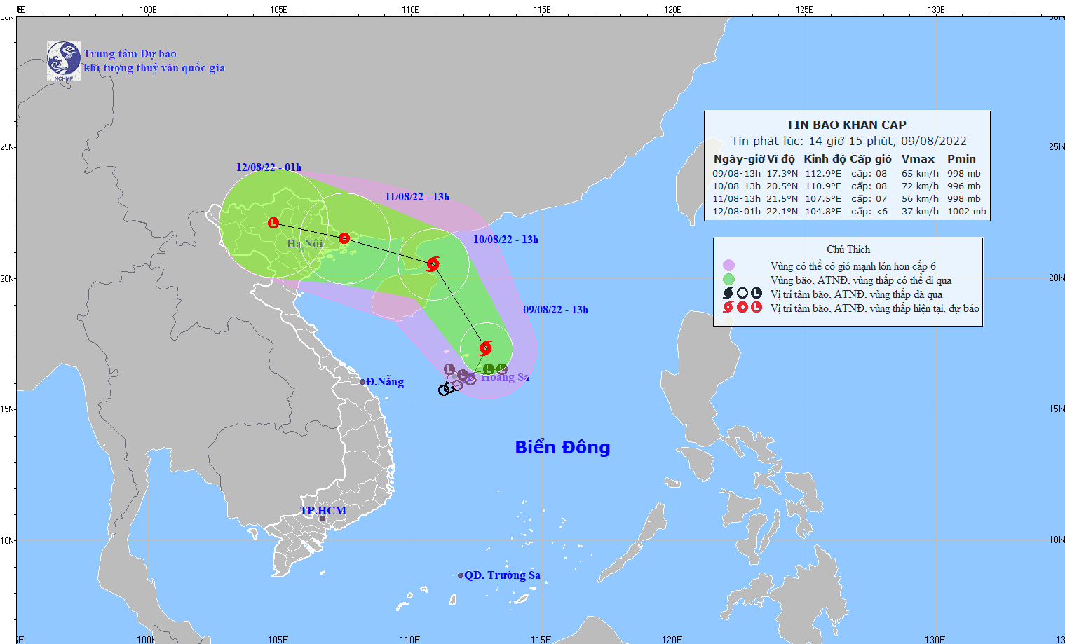 Hồi 13 giờ ngày 09/8, vị trí tâm bão ở vào khoảng 17,3 độ Vĩ Bắc; 112,9 độ Kinh Đông, trên khu vực phía Đông Bắc quần đảo Hoàng Sa; cách đảo Hải Nam (Trung Quốc) khoảng 300km về phía Đông Nam. Sức gió mạnh nhất vùng gần tâm bão mạnh cấp 8 (62-74km/giờ), giật cấp 10. Bán kính gió mạnh cấp 6, giật cấp 8 khoảng 110km tính từ tâm bão.