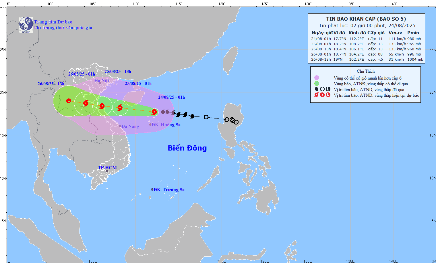 Hồi 01 giờ ngày 24/8, vị trí tâm bão ở vào khoảng 17,7 độ Vĩ Bắc; 112,2 độ Kinh Đông, trên vùng biển phía Bắc đặc khu Hoàng Sa. Sức gió mạnh nhất vùng gần tâm bão mạnh cấp 11 (103-117km/giờ), giật cấp 13; di chuyển theo hướng Tây với tốc độ 20-25km/h.