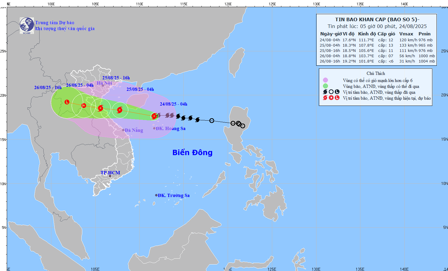 Hồi 04 giờ ngày 24/8, vị trí tâm bão ở vào khoảng 17,6 độ Vĩ Bắc; 111,7 độ Kinh Đông, trên vùng biển phía Bắc đặc khu Hoàng Sa, cách Nghệ An khoảng 660km về phía Đông Đông Nam, cách Hà Tĩnh khoảng 640km về phía Đông. Sức gió mạnh nhất vùng gần tâm bão mạnh cấp 12 (118-133km/giờ), giật cấp 15; di chuyển theo hướng Tây với tốc độ khoảng 20km/h.