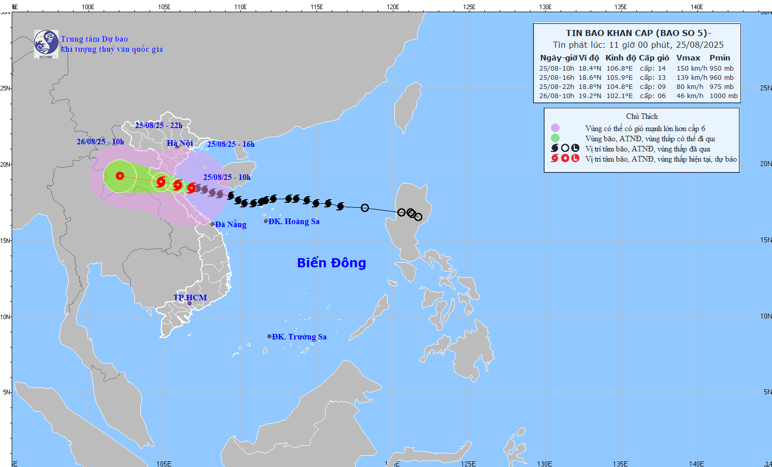 Trong 6 giờ tới, bão di chuyển theo hướng Tây Tây Bắc, tốc độ khoảng 15-20km/h; đến 16h ngày 25/8, vị trí tâm bão ở khoảng 18,6N-105,9E; trên vùng bờ biển các tỉnh Thanh Hóa-Hà Tĩnh; cường độ cấp 12-13, giật cấp 15.