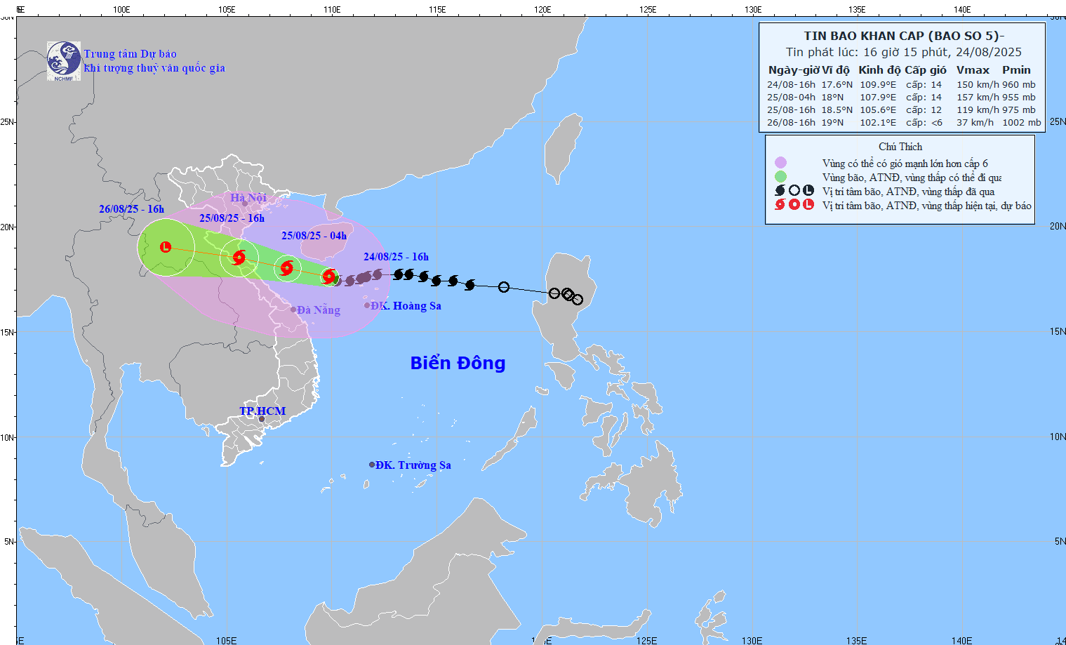 Hồi 16 giờ ngày 24/8, vị trí tâm bão ở vào khoảng 17,6 độ Vĩ Bắc; 109,9 độ Kinh Đông, cách Nghệ An khoảng 470km, cách Hà Tĩnh khoảng 450km về phía Đông Đông Nam, cách Bắc Quảng Trị khoảng 390km về phía Đông. Sức gió mạnh nhất vùng gần tâm bão mạnh cấp 13-14 (134-166km/giờ), giật cấp 16; di chuyển theo hướng Tây với tốc độ khoảng 20km/h và còn có khả năng mạnh thêm.
