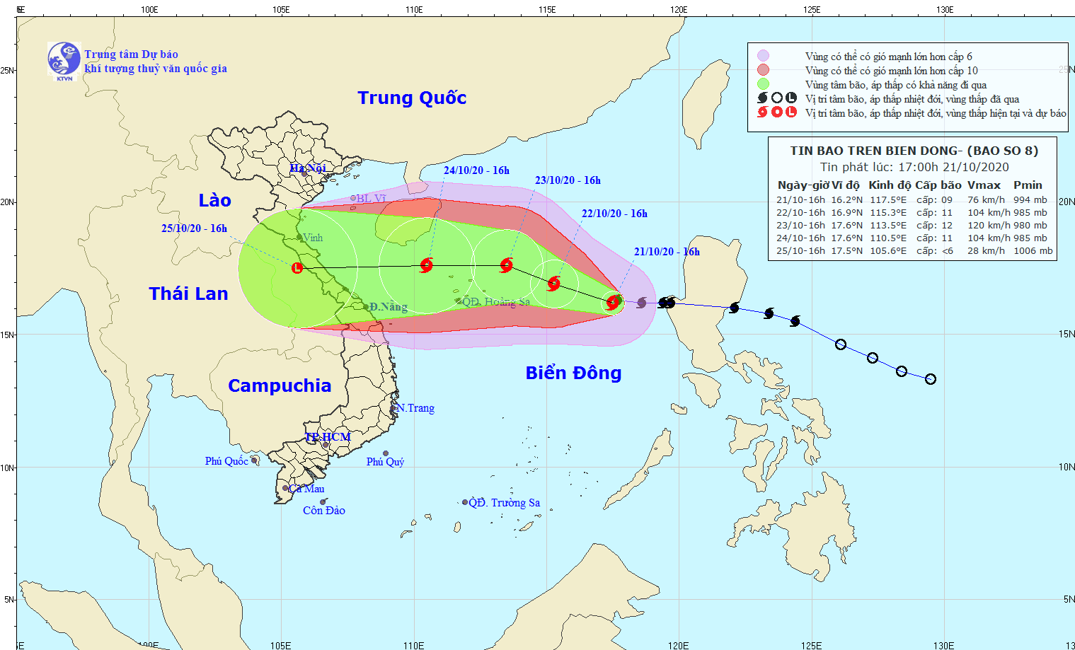Hồi 16 giờ ngày (21/10), vị trí tâm bão ở khoảng 16,2 độ Vĩ Bắc; 117,5 độ Kinh Đông, cách quần đảo Hoàng Sa khoảng 540km về phía Đông. Sức gió mạnh nhất vùng gần tâm bão mạnh cấp 9 (75-90km/giờ), giật cấp 11. Bán kính gió mạnh từ cấp 6, giật từ cấp 8 trở lên khoảng 130km tính từ tâm bão.