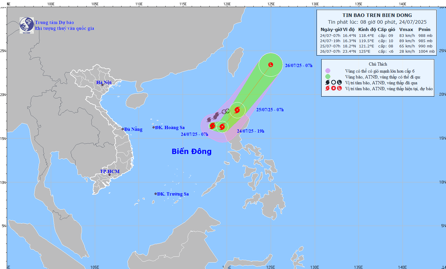 Hồi 07 giờ ngày 24/7, vị trí tâm bão ở vào khoảng 16,4 độ Vĩ Bắc; 118,4 độ Kinh Đông, trên vùng biển phía Đông của khu vực Bắc Biển Đông. Sức gió mạnh nhất vùng gần tâm bão mạnh cấp 9 (75-88km/giờ), giật cấp 11; di chuyển theo hướng Nam Đông Nam với tốc độ khoảng 15km/h.