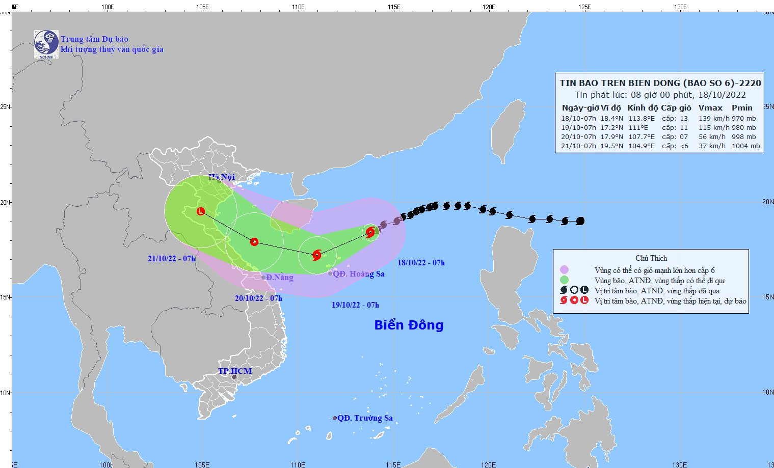 Hồi 07 giờ ngày 18/10, vị trí tâm bão ở vào khoảng 18,4 độ Vĩ Bắc; 113,8 độ Kinh Đông, cách quần đảo Hoàng Sa khoảng 310km về phía Đông Bắc. Sức gió mạnh nhất vùng gần tâm bão mạnh cấp 12-13 (118-149km/giờ), giật cấp 15, di chuyển theo hướng Tây Tây Nam với tốc độ khoảng 15km/h.