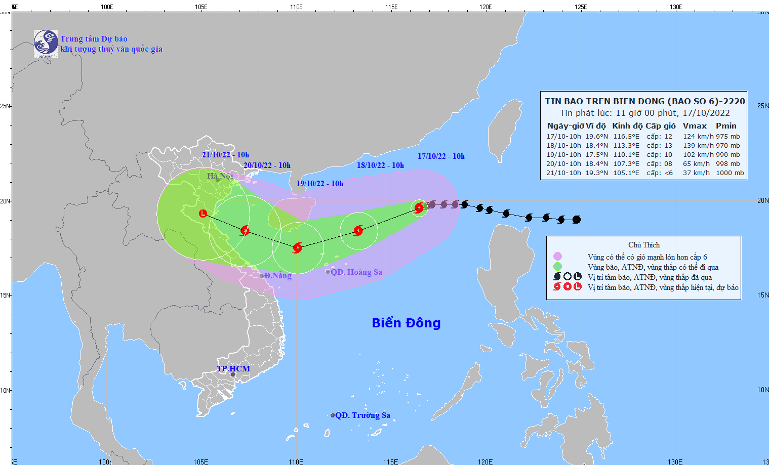 Hồi 10 giờ ngày 17/10, vị trí tâm bão ở vào khoảng 19,6 độ Vĩ Bắc; 116,5 độ Kinh Đông, cách quần đảo Hoàng Sa khoảng 600km về phía Đông Bắc. Sức gió mạnh nhất vùng gần tâm bão mạnh cấp 11-12 (103-133km/giờ), giật cấp 14, di chuyển theo hướng Tây Tây Nam với tốc độ khoảng 15km/h.