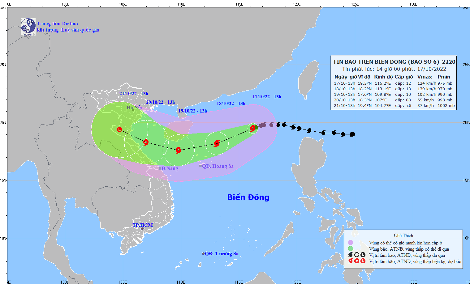Hồi 13 giờ ngày 17/10, vị trí tâm bão ở vào khoảng 19,5 độ Vĩ Bắc; 116,2 độ Kinh Đông, cách quần đảo Hoàng Sa khoảng 520km về phía Đông Bắc. Sức gió mạnh nhất vùng gần tâm bão mạnh cấp 12 (118-133km/giờ), giật cấp 14, di chuyển theo hướng Tây Tây Nam với tốc độ khoảng 15km/h.