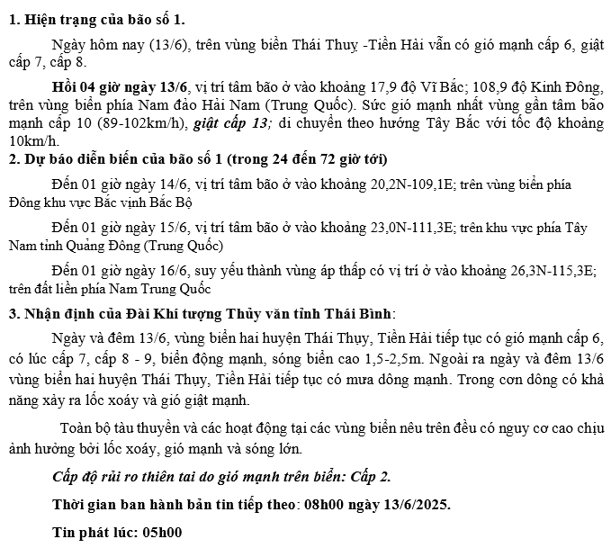 TIN BÃO TRÊN BIỂN ĐÔNG (CƠN BÃO SỖ 01) HỒI 04h00 NGÀY 13/6/2025
