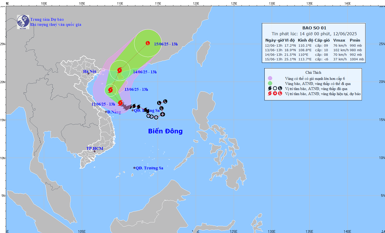 Hồi 13 giờ ngày 12/6, vị trí tâm bão ở vào khoảng 17,2 độ Vĩ Bắc; 110,1 độ Kinh Đông trên khu vực phía Tây quần đảo Hoàng Sa. Sức gió mạnh nhất vùng gần tâm bão mạnh cấp 9 (75-88km/h), giật cấp 11; di chuyển theo hướng Tây Tây Bắc với tốc độ 5-10km/h.