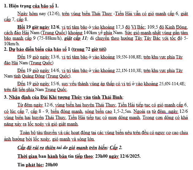 TIN BÃO TRÊN BIỂN ĐÔNG (CƠN BÃO SỖ 01) HỒI 19h00 NGÀY 12/6/2025