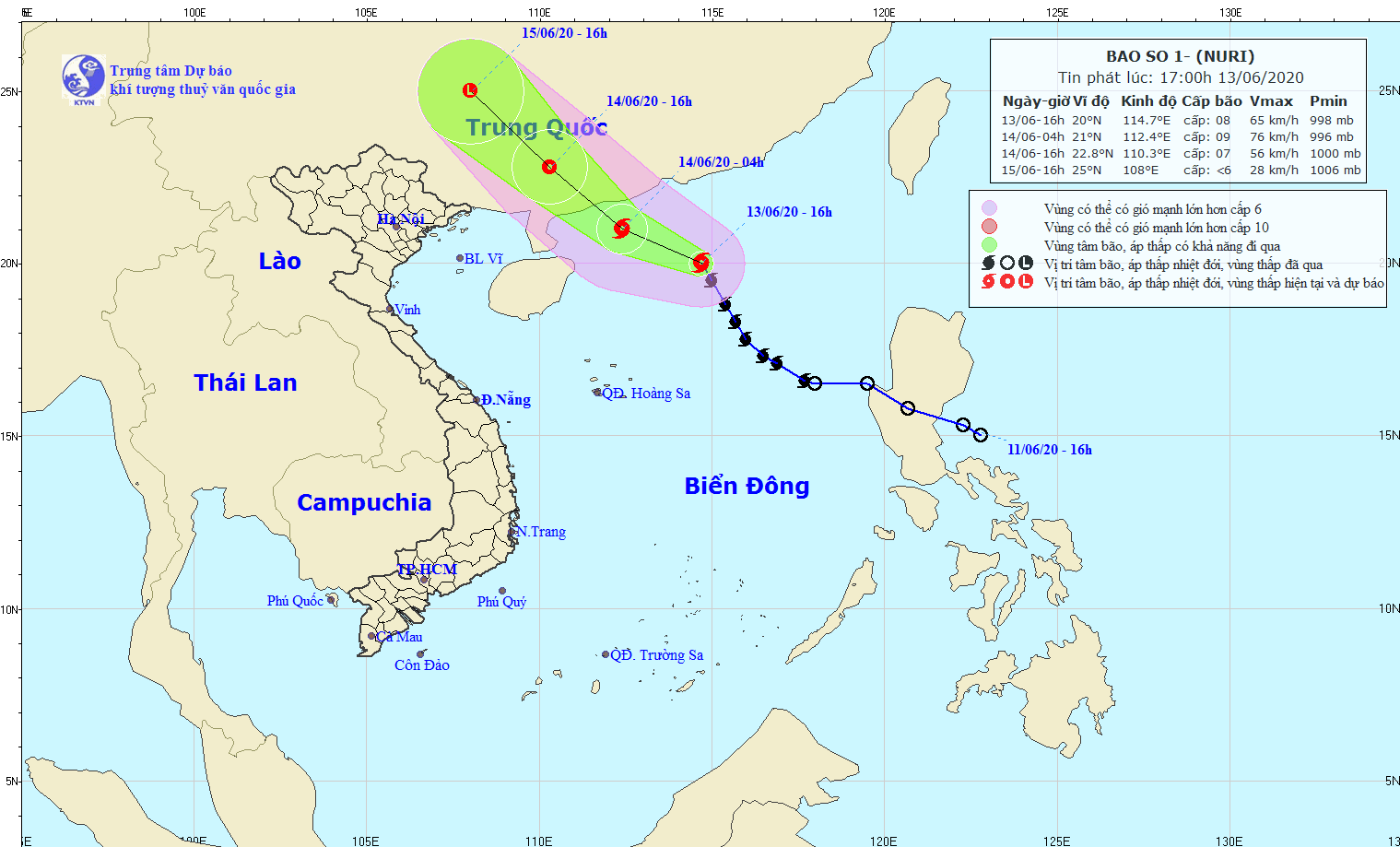 Dự báo trong 12 giờ tới, bão di chuyển theo hướng Tây Tây Bắc, mỗi giờ đi được 20-25 km và có khả năng mạnh thêm. Đến 04 giờ ngày 14/6, vị trí tâm bão ở khoảng 21,0 độ Vĩ Bắc; 112,4 độ Kinh Đông, ngay trên vùng biển phía Nam tỉnh Quảng Đông (Trung Quốc). Sức gió mạnh nhất vùng gần tâm bão mạnh cấp 8-9 (60-90km/giờ), giật cấp 12.