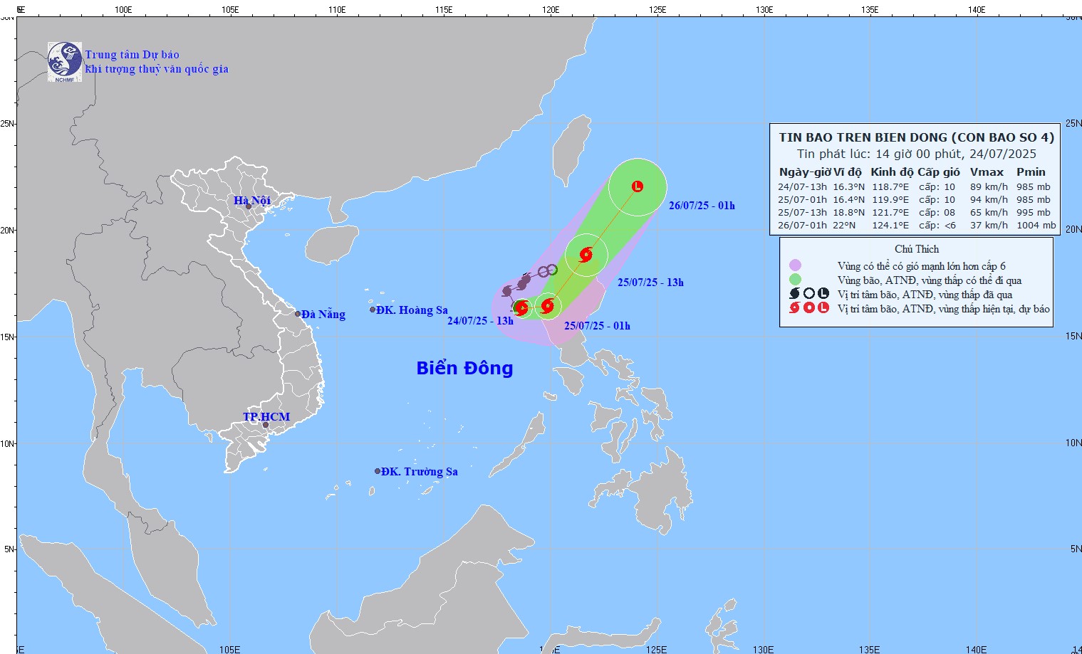 Hồi 13 giờ ngày 24/7, vị trí tâm bão ở vào khoảng 16,3 độ Vĩ Bắc; 118,7 độ Kinh Đông, trên vùng biển phía Đông của khu vực Bắc Biển Đông. Sức gió mạnh nhất vùng gần tâm bão mạnh cấp 9-10 (75-102km/giờ), giật cấp 12; di chuyển theo hướng Đông Đông Nam với tốc độ khoảng 10 km/h.