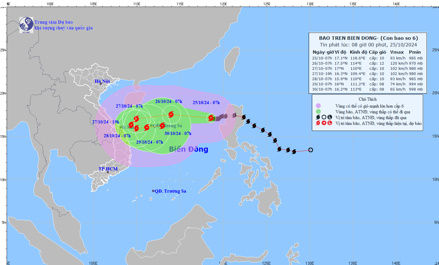 Hồi 07 giờ ngày 25/10, vị trí tâm bão ở vào khoảng 17,1 độ Vĩ Bắc; 118,6 độ Kinh Đông, trên vùng biển phía Đông của khu vực Bắc Biển Đông. Sức gió mạnh nhất vùng gần tâm bão mạnh cấp 10 (89-102km/h), giật cấp 12. Di chuyển theo hướng Tây, tốc độ khoảng 15km/h.