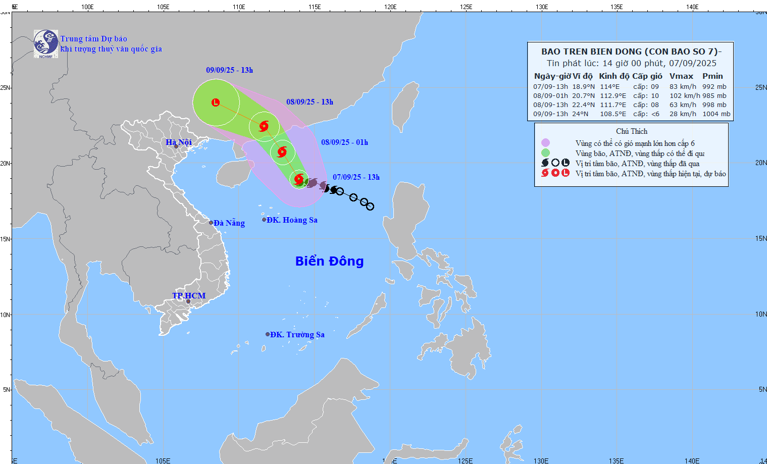 Hồi 13h ngày 07/9, tâm bão ở khoảng 18,9 độ Vĩ Bắc; 114,0 độ Kinh Đông, trên vùng biển phía Bắc khu vực Bắc Biển Đông.