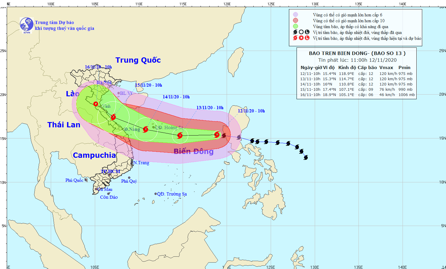 Trong 24 đến 48 giờ tiếp theo, bão di chuyển chủ yếu theo hướng Tây Tây Bắc, mỗi giờ đi được 15-20km. Đến 10 giờ ngày 14/11, vị trí tâm bão ở khoảng 16,0 độ Vĩ Bắc; 110,8 độ Kinh Đông, trên vùng biển phía Tây Nam quần đảo Hoàng Sa. Sức gió mạnh nhất vùng gần tâm bão mạnh cấp 12 (115-135km/giờ), giật cấp 15.