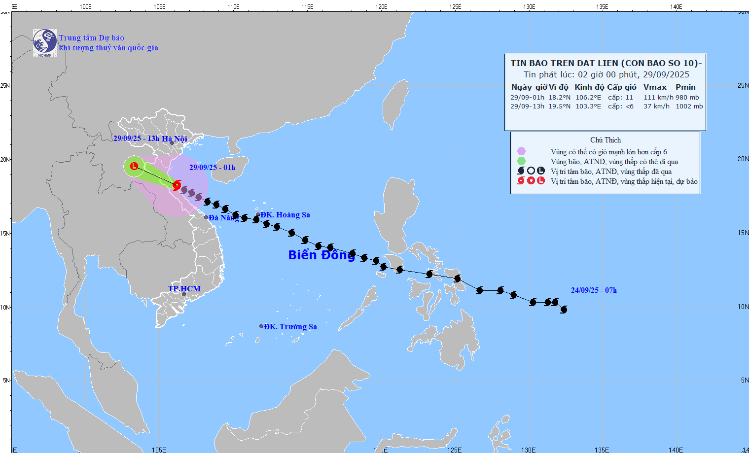 Hồi 01 giờ ngày 29/9, vị trí tâm bão ở vào khoảng 18,2 độ Vĩ Bắc; 106,2 độ Kinh Đông, trên đất liền ven biển tỉnh Hà Tĩnh. Sức gió mạnh nhất vùng gần tâm bão mạnh cấp 11 (103-117km/giờ), giật cấp 14. Di chuyển theo hướng Tây Tây Bắc, tốc độ 20-25km/h.