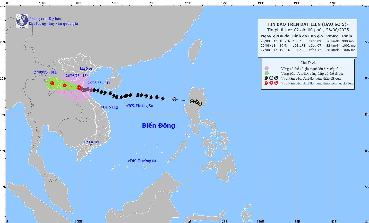 Hồi 01 giờ ngày 26/8, vị trí tâm bão ở vào khoảng 18,7 độ Vĩ Bắc; 105,1 độ Kinh Đông, trên khu vực biên giới Việt-Lào. Sức gió mạnh nhất vùng gần tâm bão mạnh cấp 8-9 (62-88km/giờ), giật cấp 11; di chuyển theo hướng Tây Tây Bắc với tốc độ 10-15km/giờ.