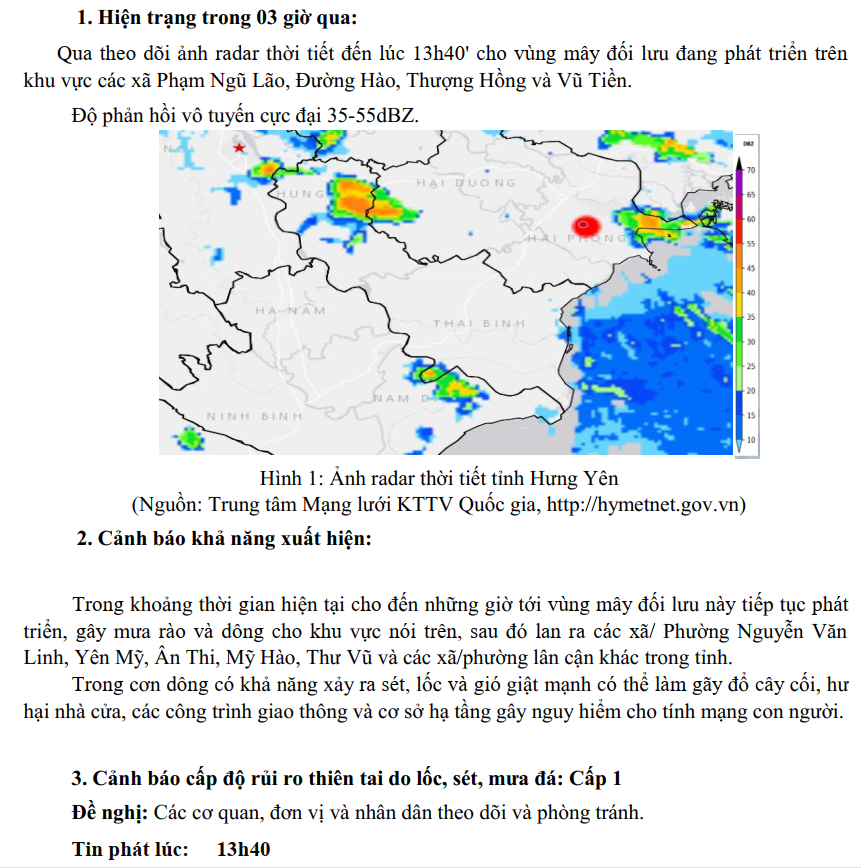 TIN CẢNH BÁO DÔNG, LỐC, SÉT, MƯA ĐÁ VÀ MƯA LỚN CỤC BỘ TỈNH HƯNG YÊN (NGÀY 08/9/2025-Lần 1)